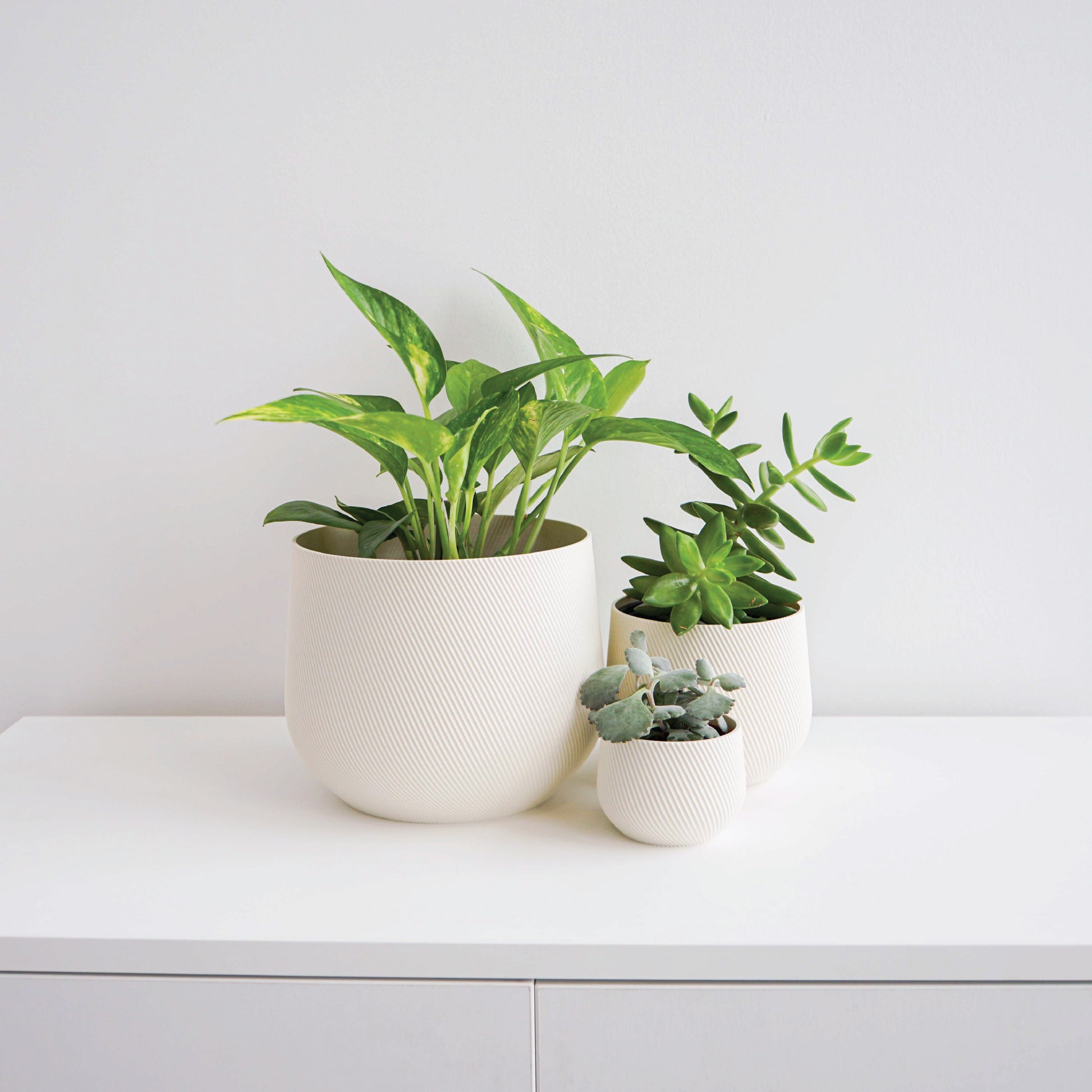 Our material is not only sustainable, but it looks and feels fantastic! All of our products 3D printed using a light weight, matte bio-polymer. Our plant based material is made to stand the test of time and plants can be planted directly inside or in their nursery pot.