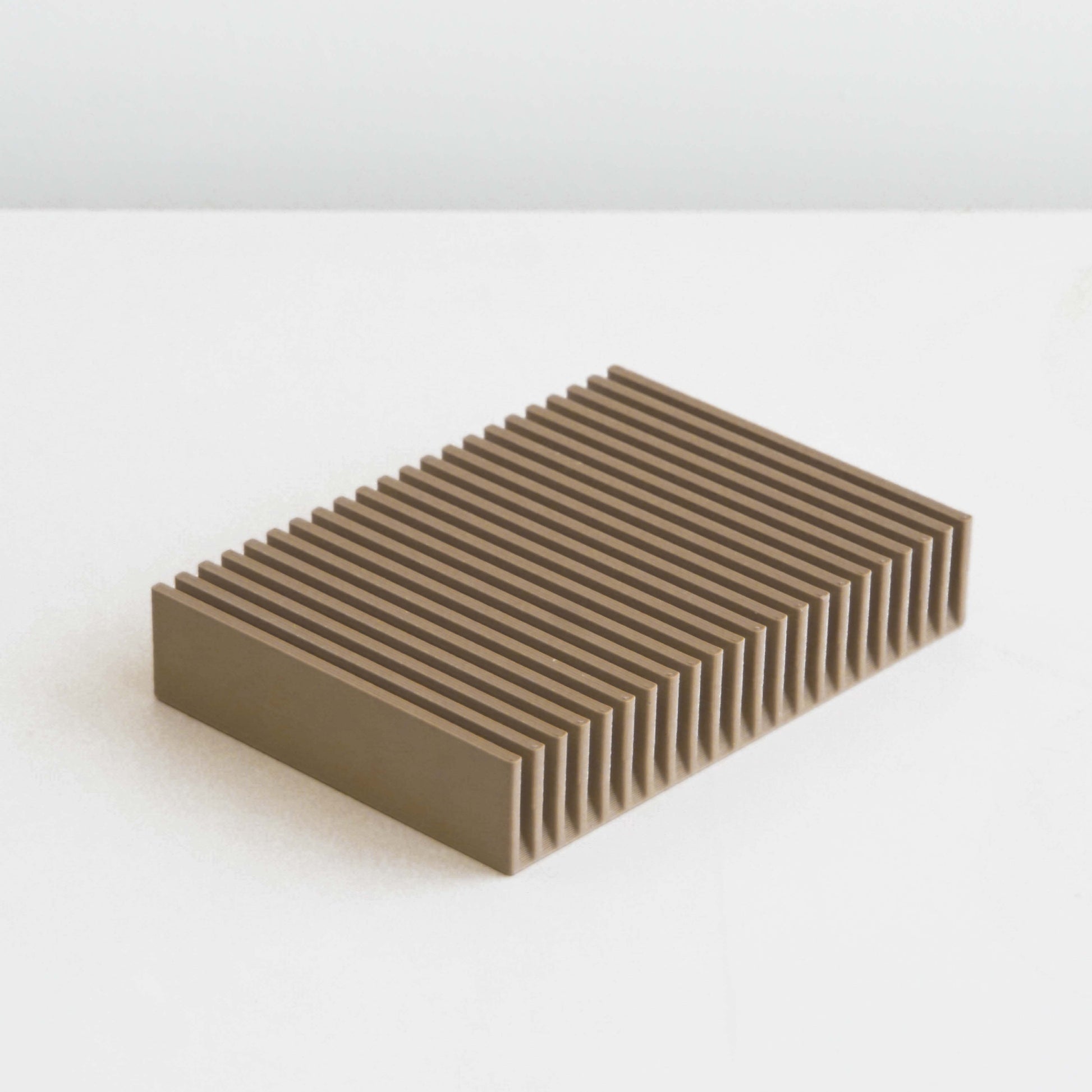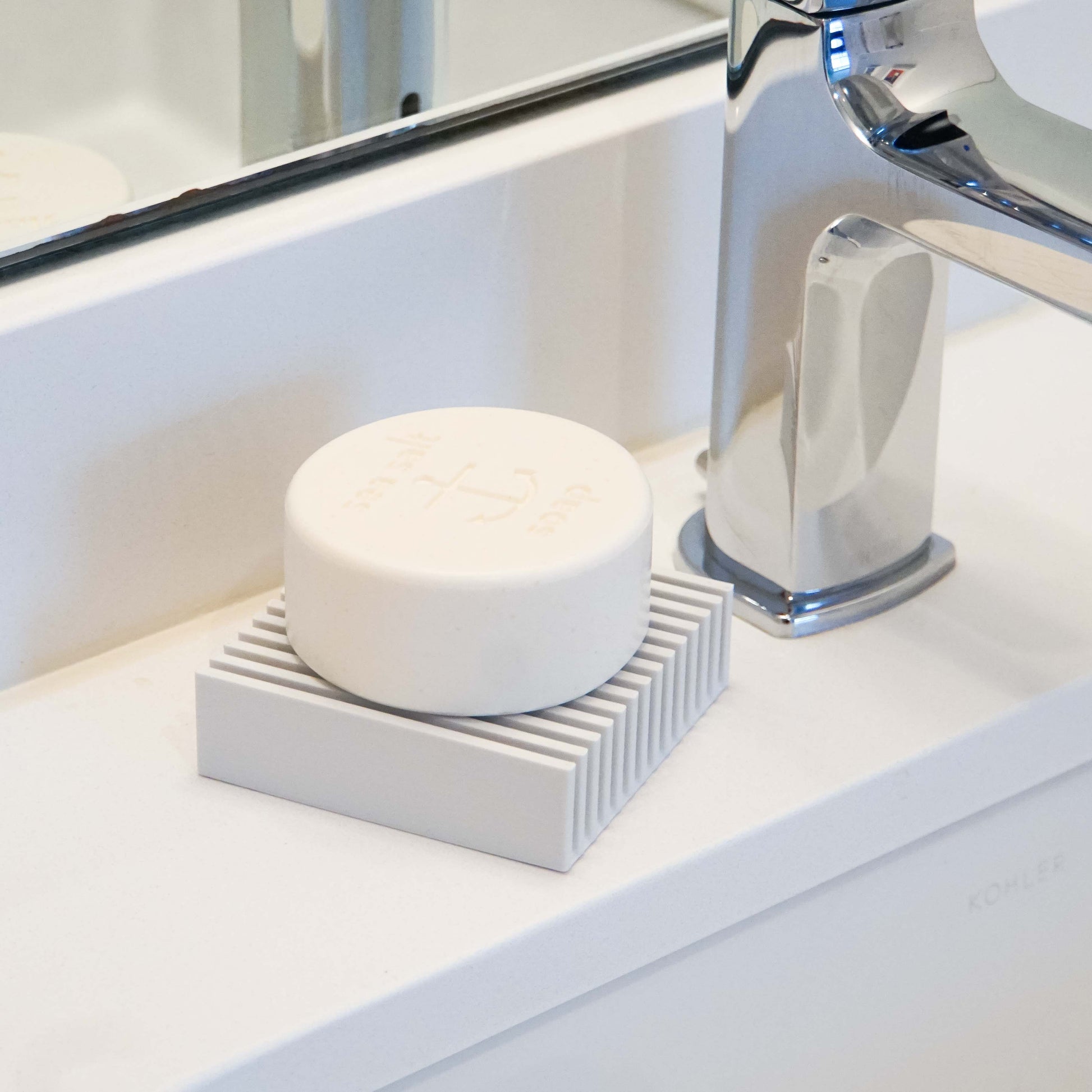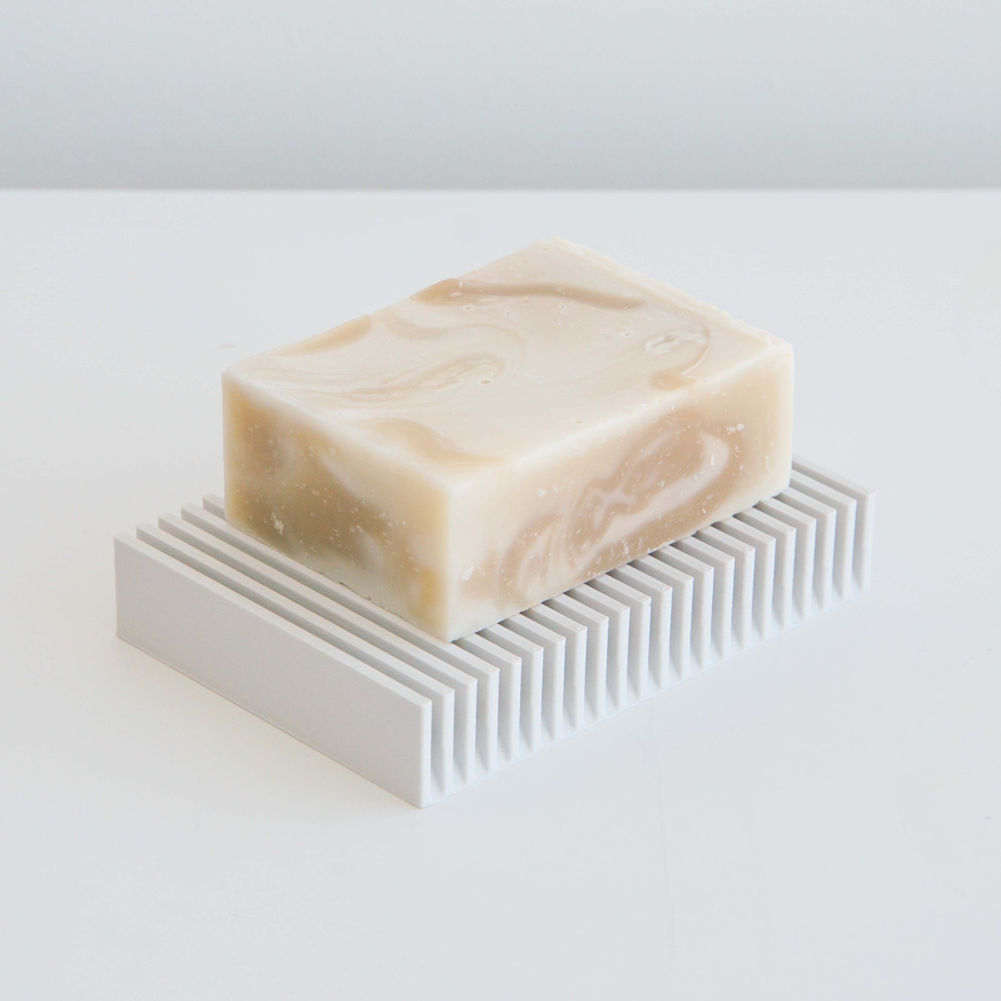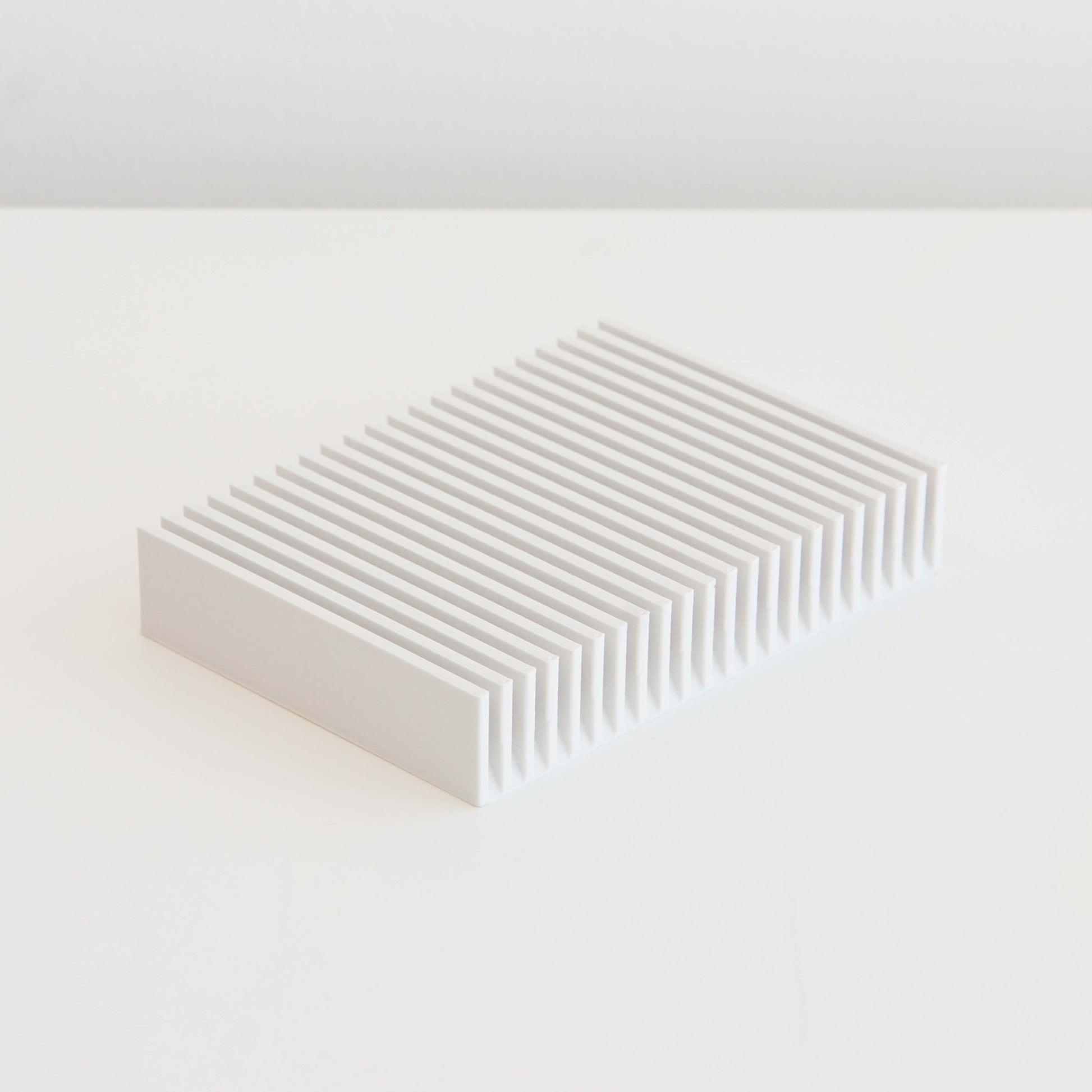 The Douglas Soap Tray utilizes a repetitive geometric pattern to camouflage its internal drip catcher.  Its simple geometric form emphasizes the play between light and dark adding a touch of nuance to the minimal form.