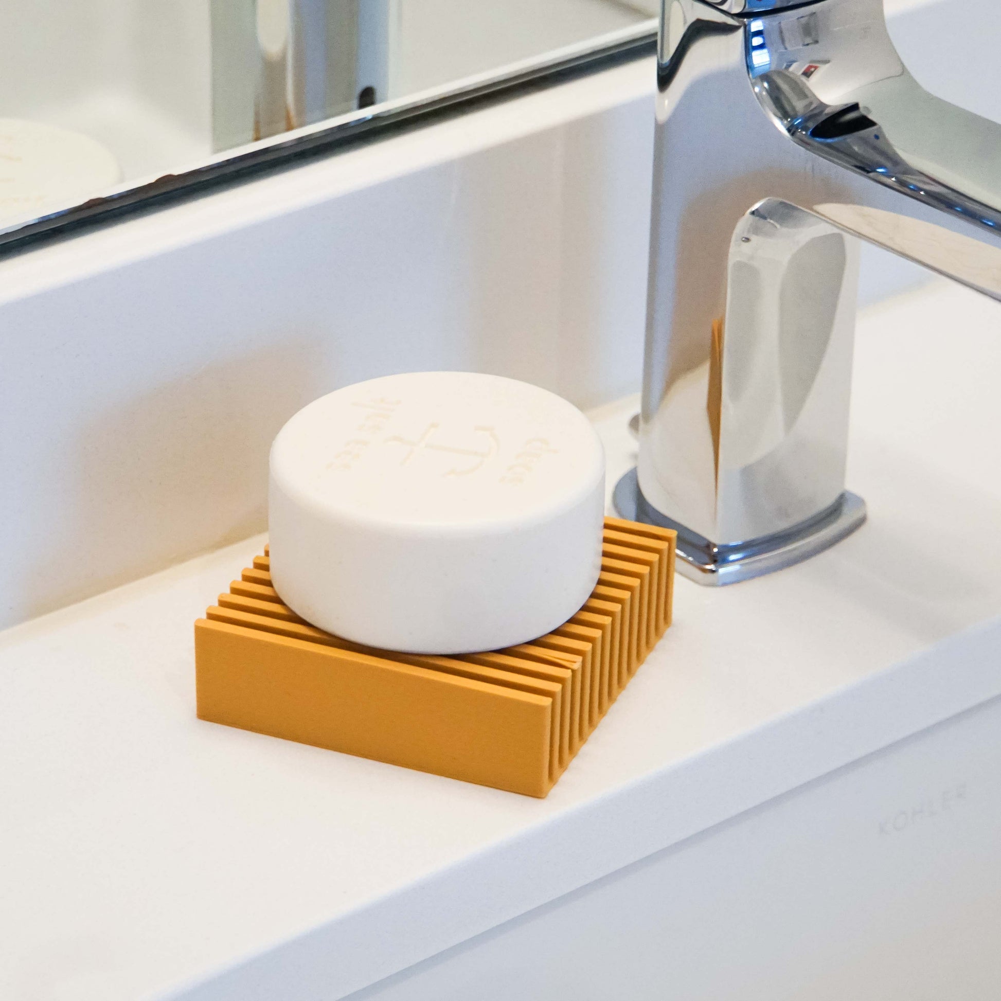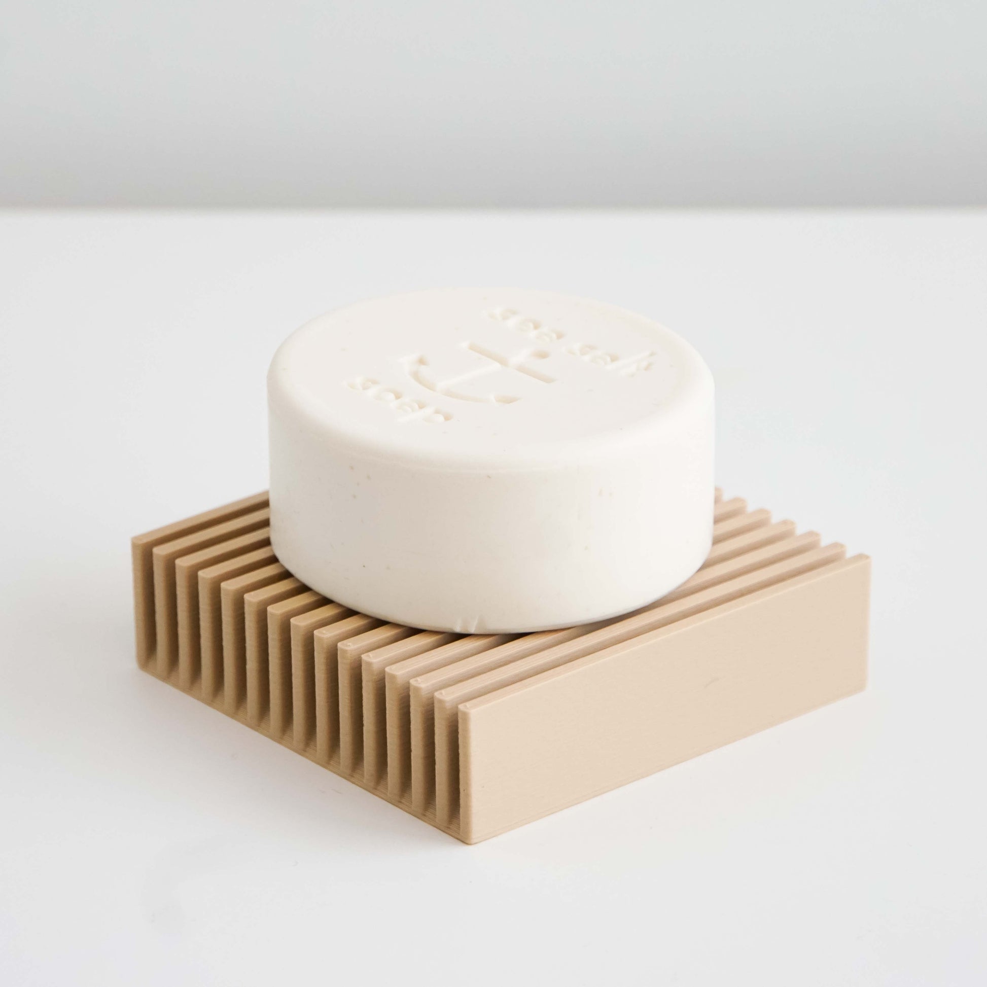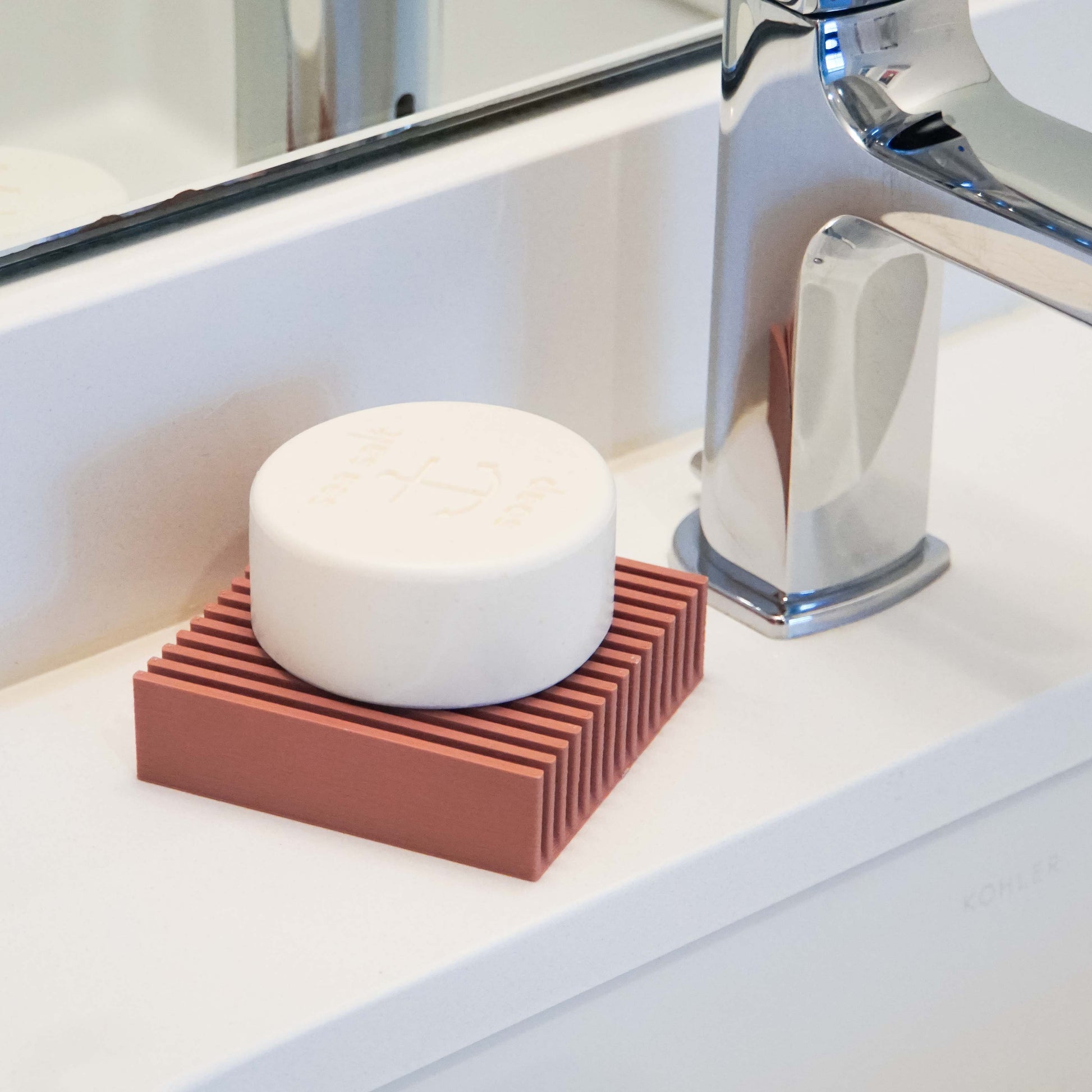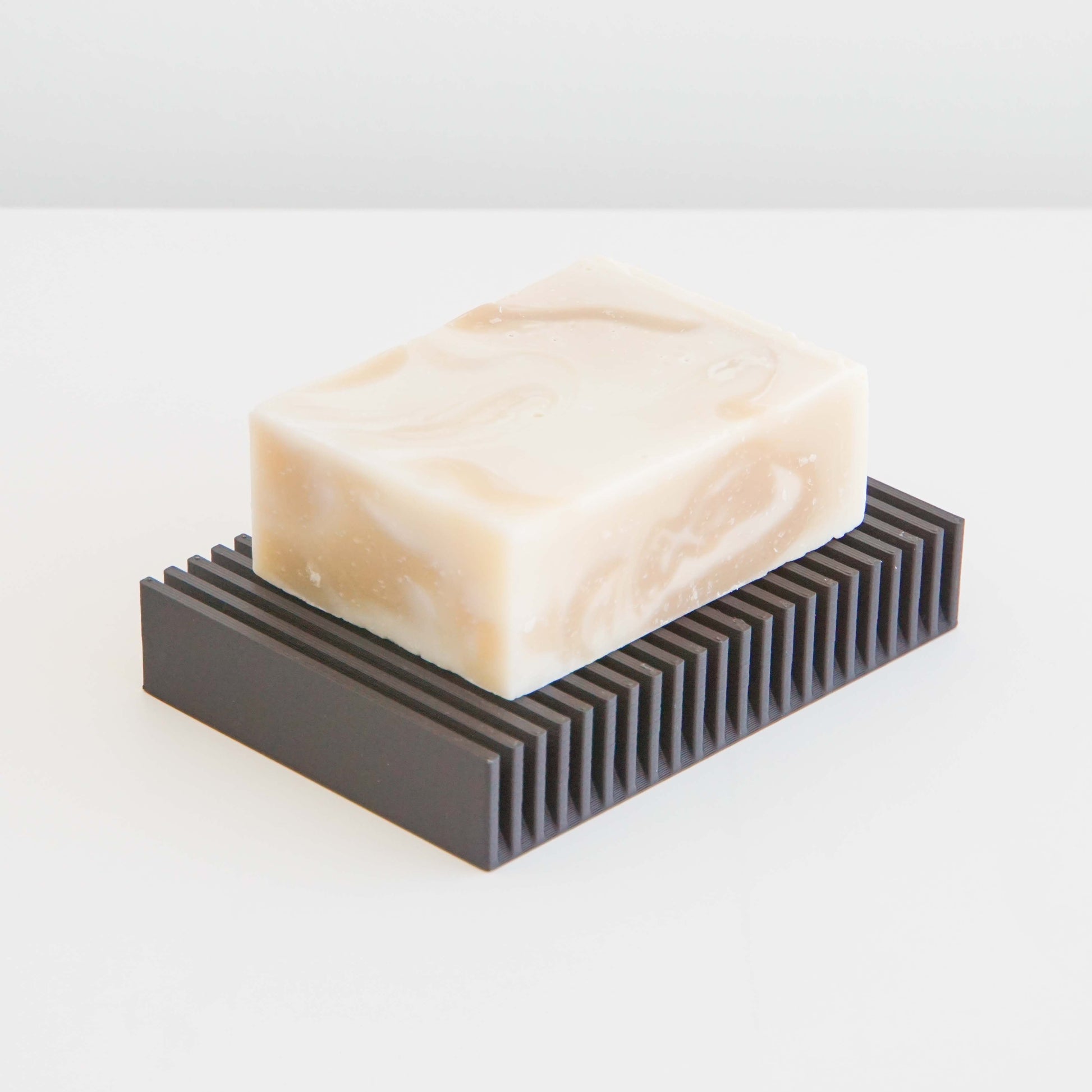 The Douglas Soap Tray utilizes a repetitive geometric pattern to camouflage its internal drip catcher.  Its simple geometric form emphasizes the play between light and dark adding a touch of nuance to the minimal form.