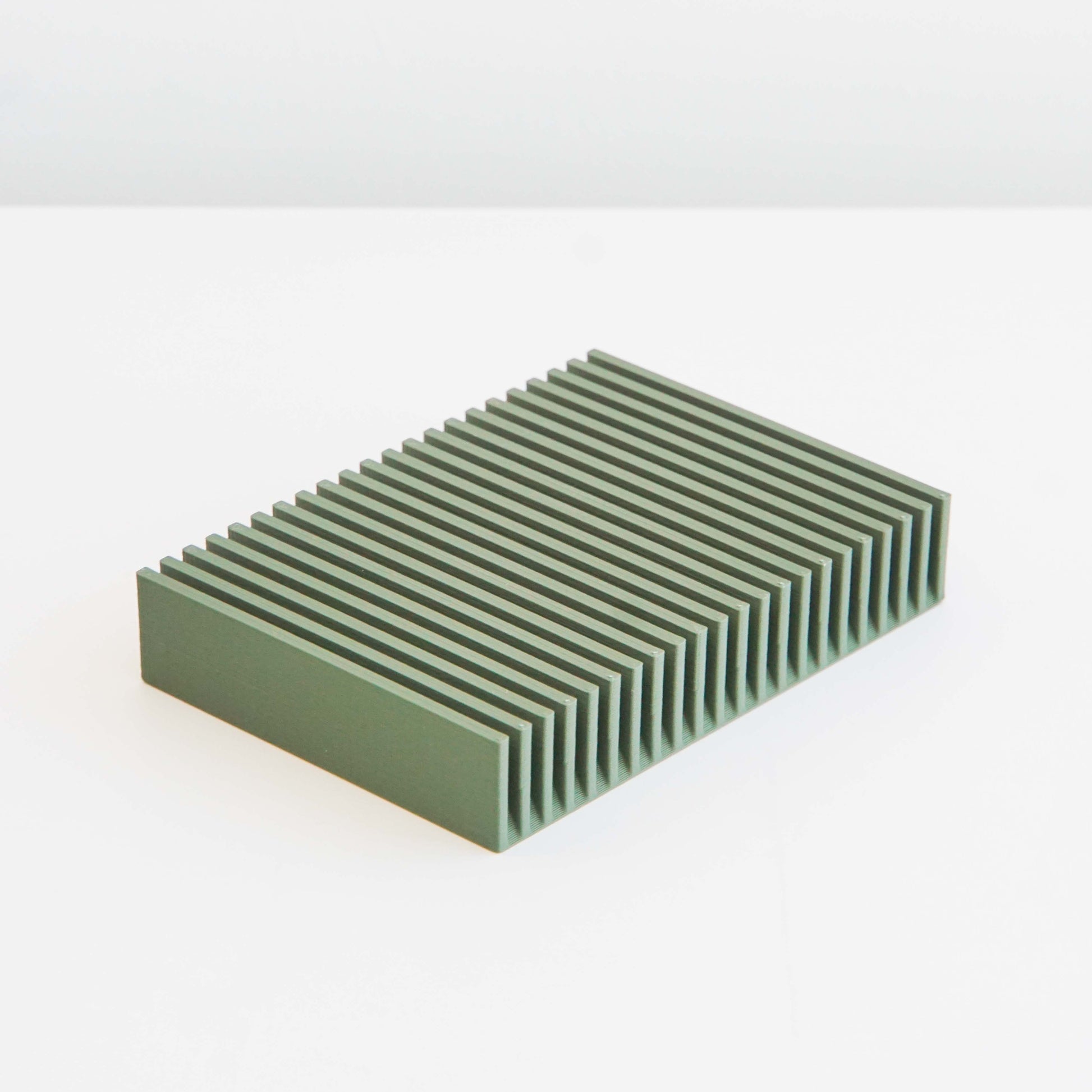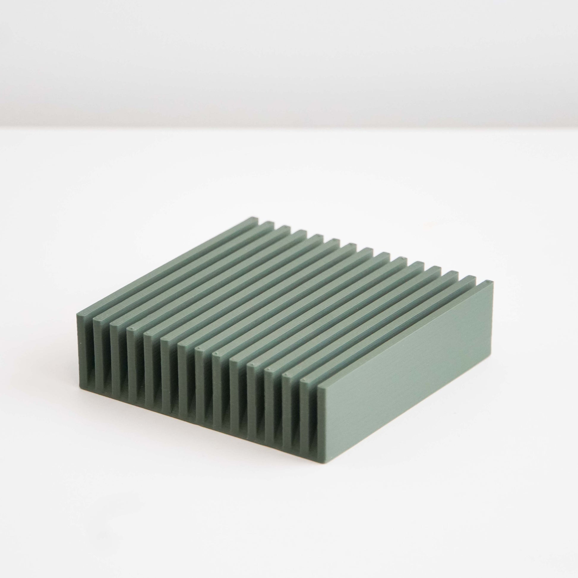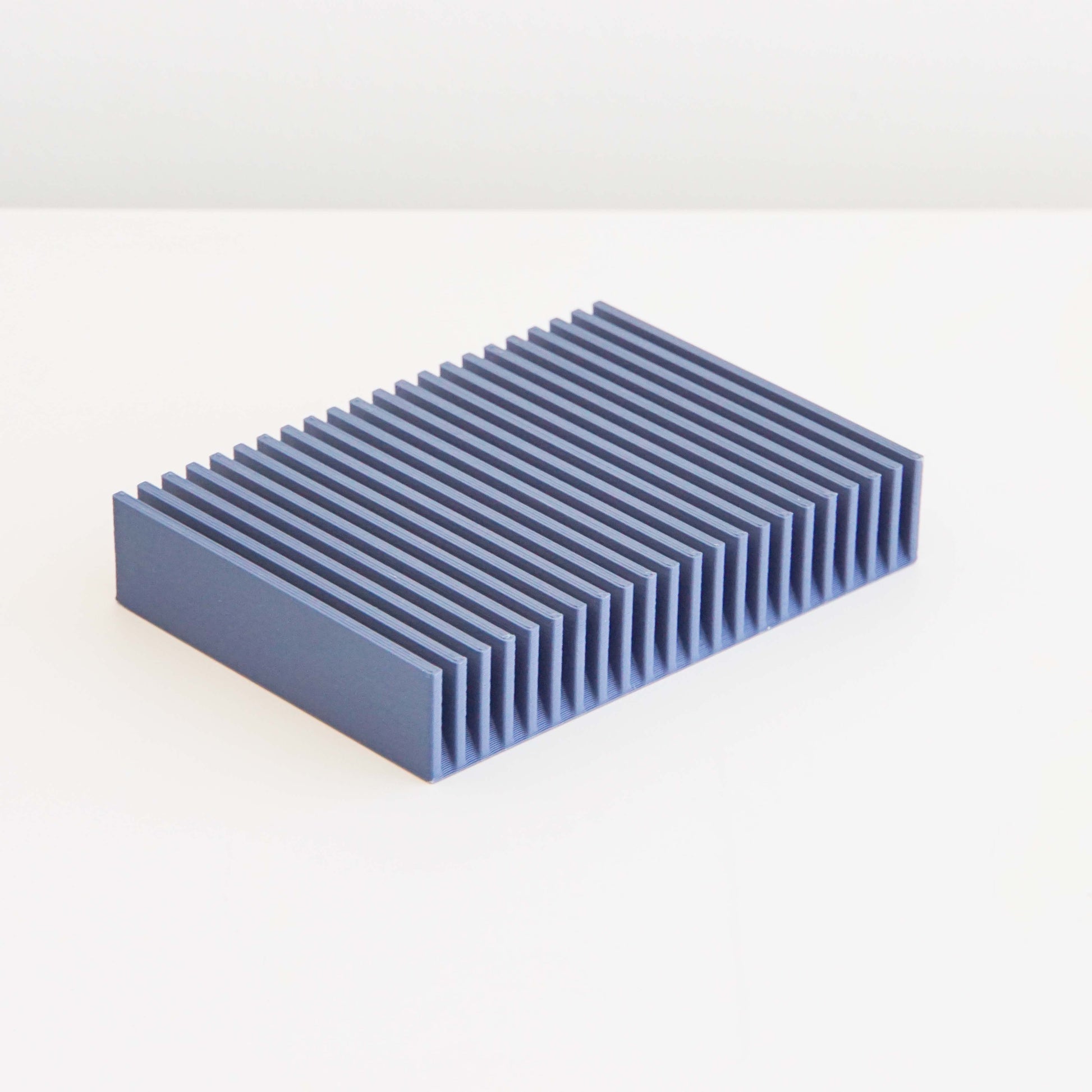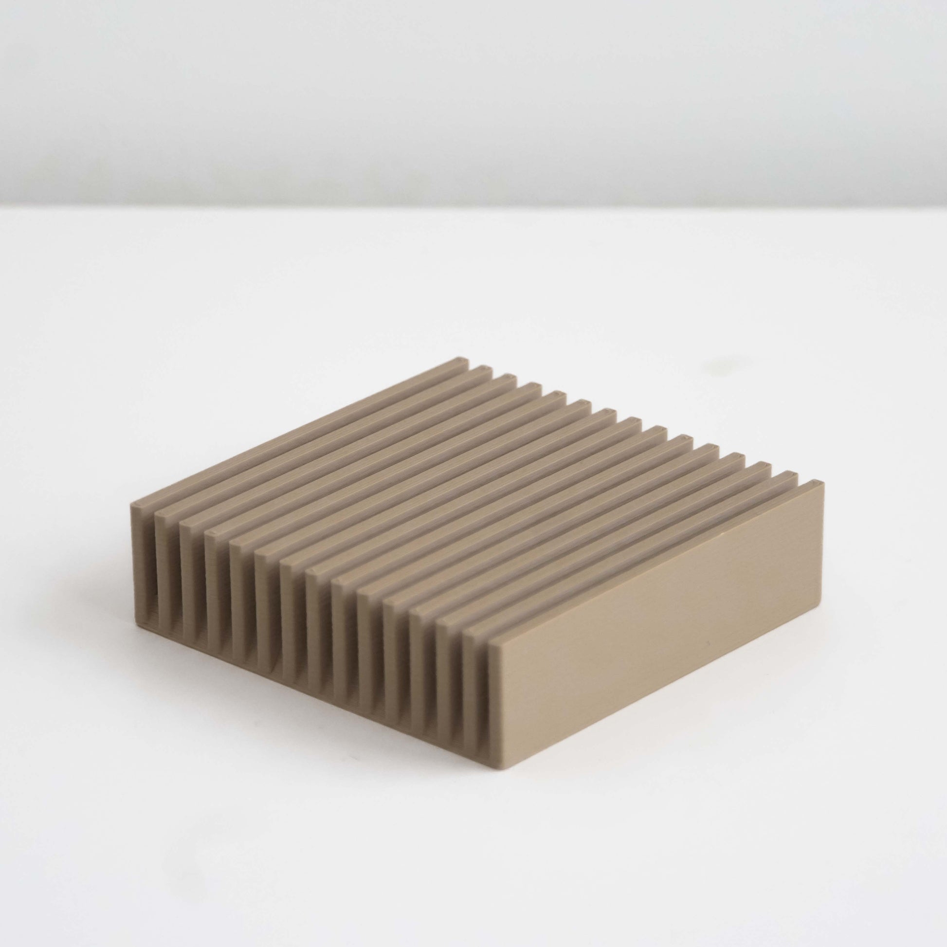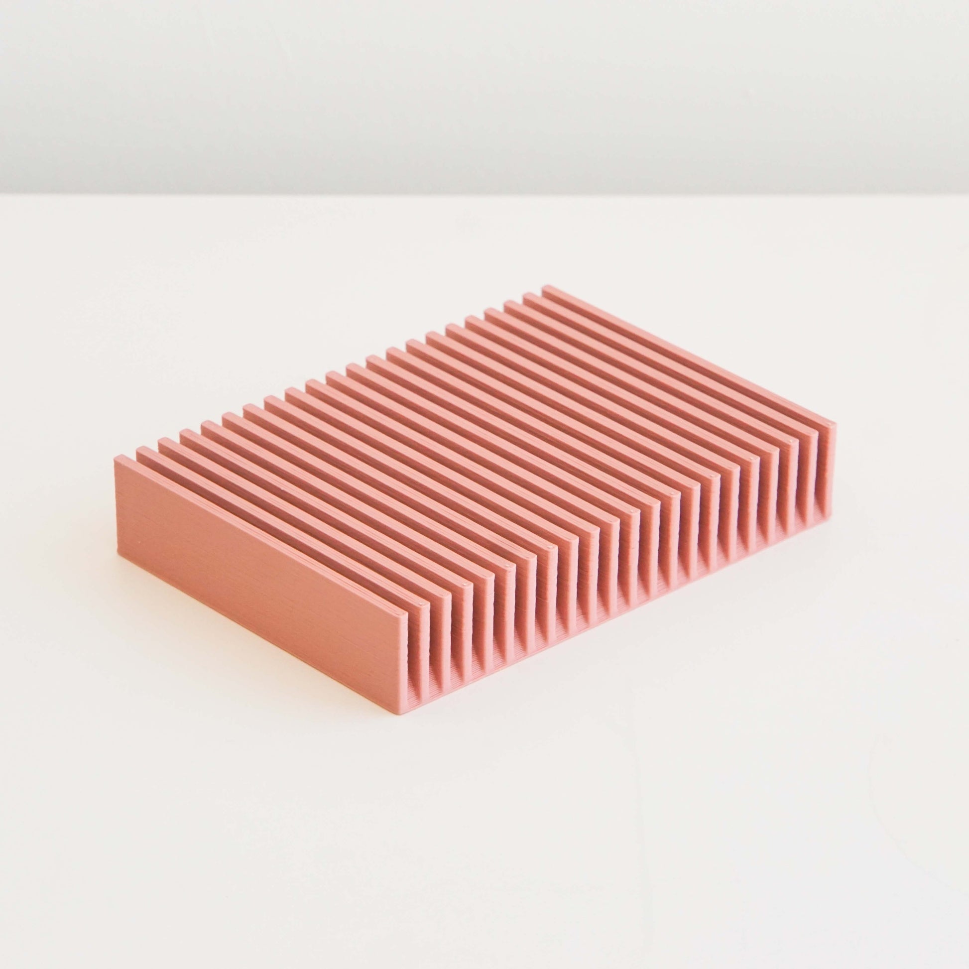 The Douglas Soap Tray utilizes a repetitive geometric pattern to camouflage its internal drip catcher.  Its simple geometric form emphasizes the play between light and dark adding a touch of nuance to the minimal form.