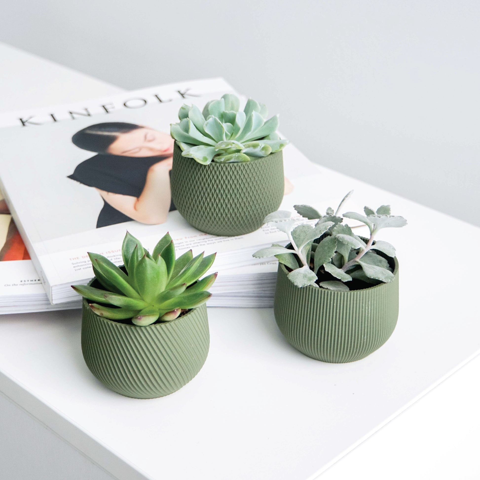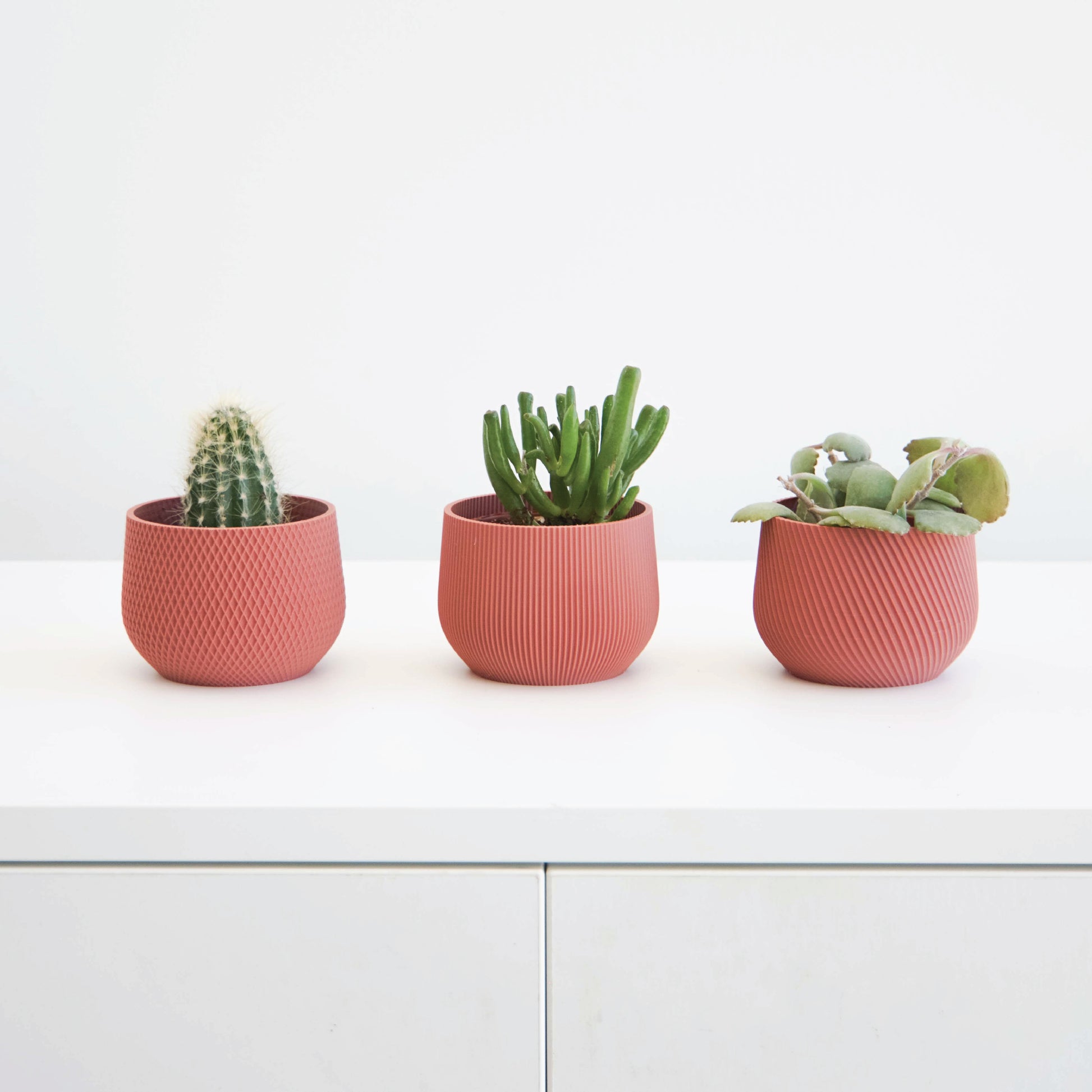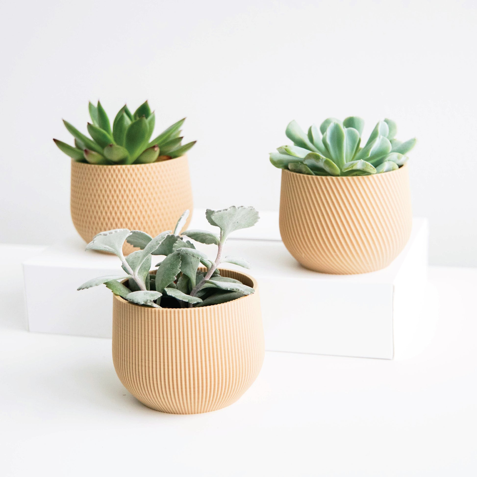 This mini indoor planter set is perfect for small succulents and cacti. They are 3D printed using sustainable, plant-based materials and are 100% zero waste! The planters perfectly fit 2" potted plants.