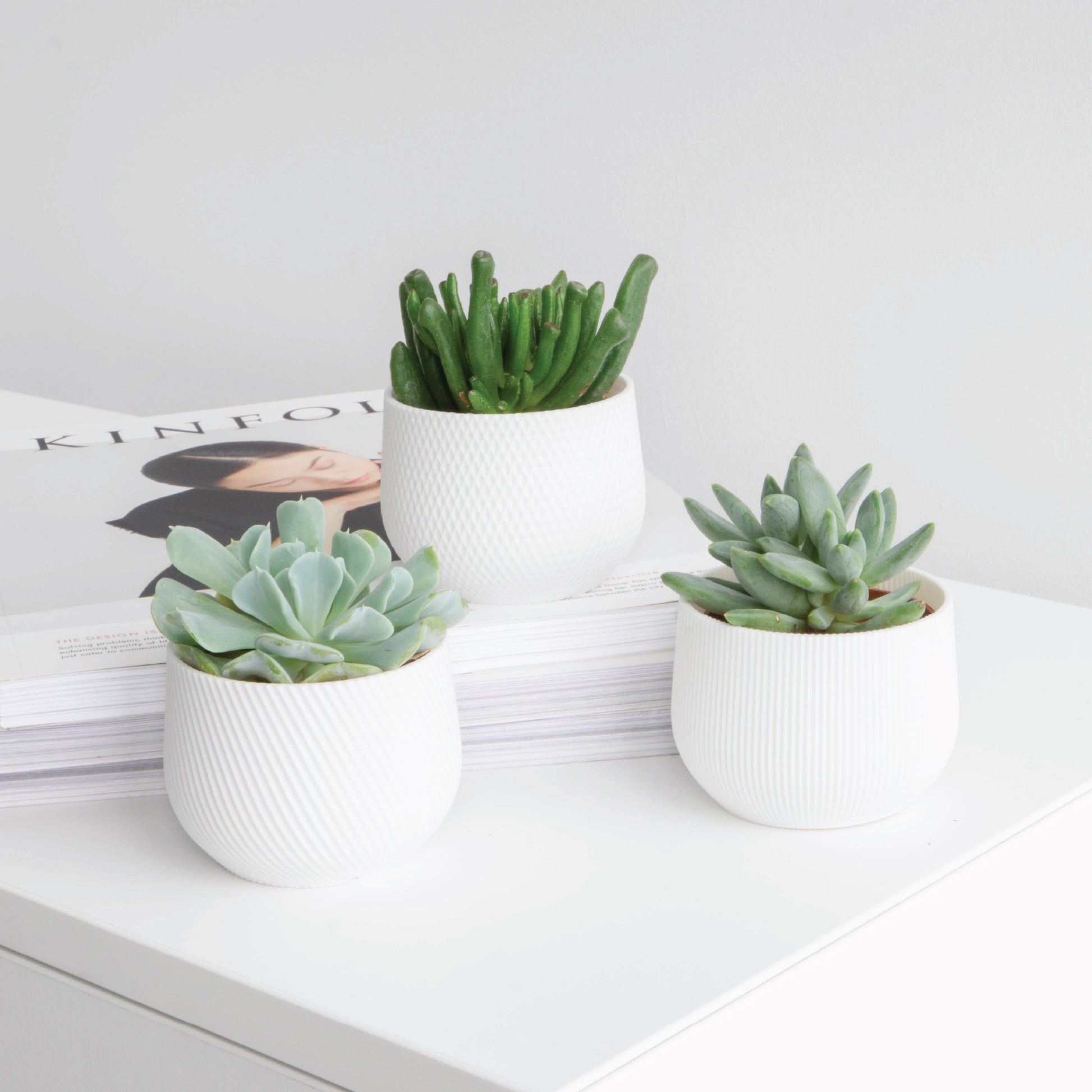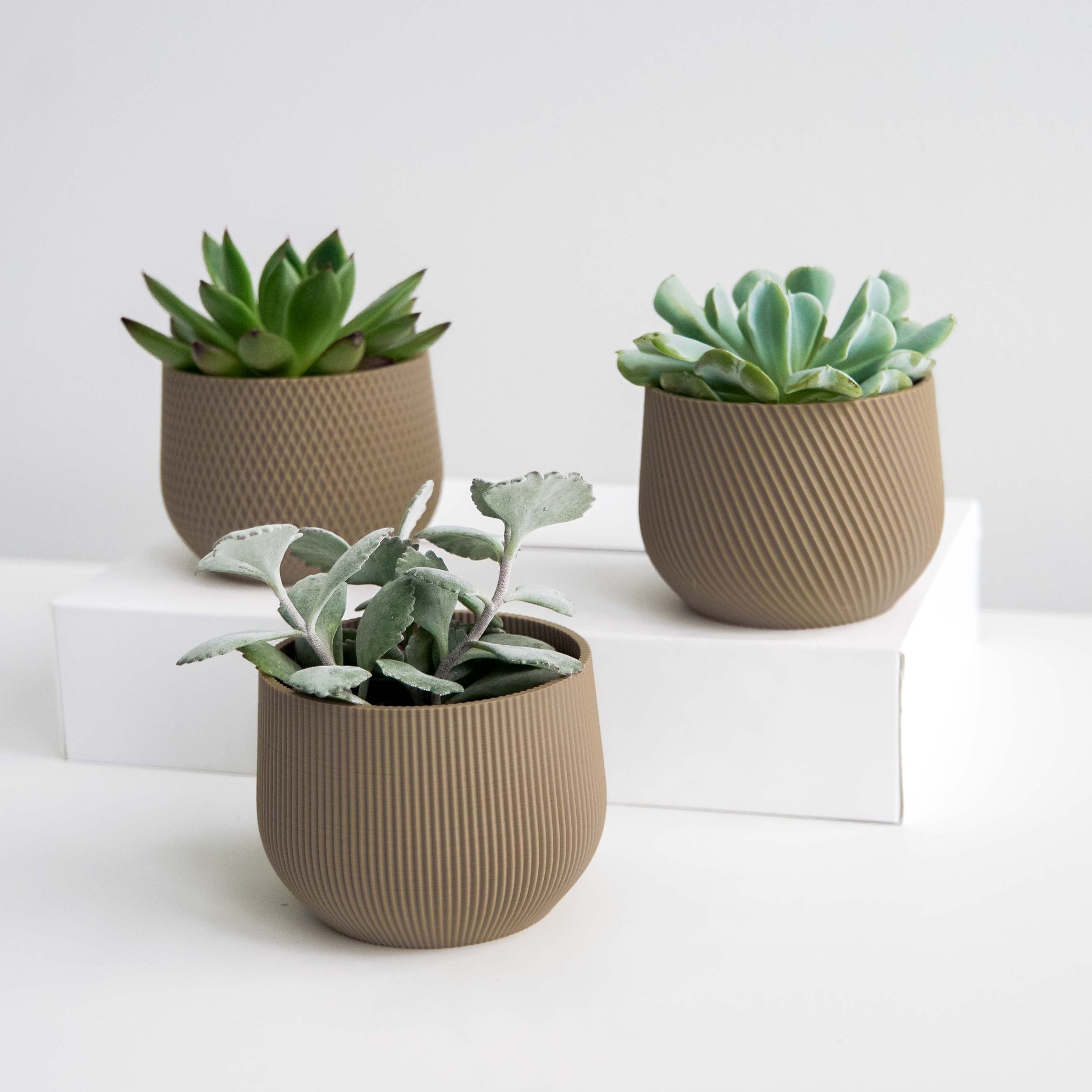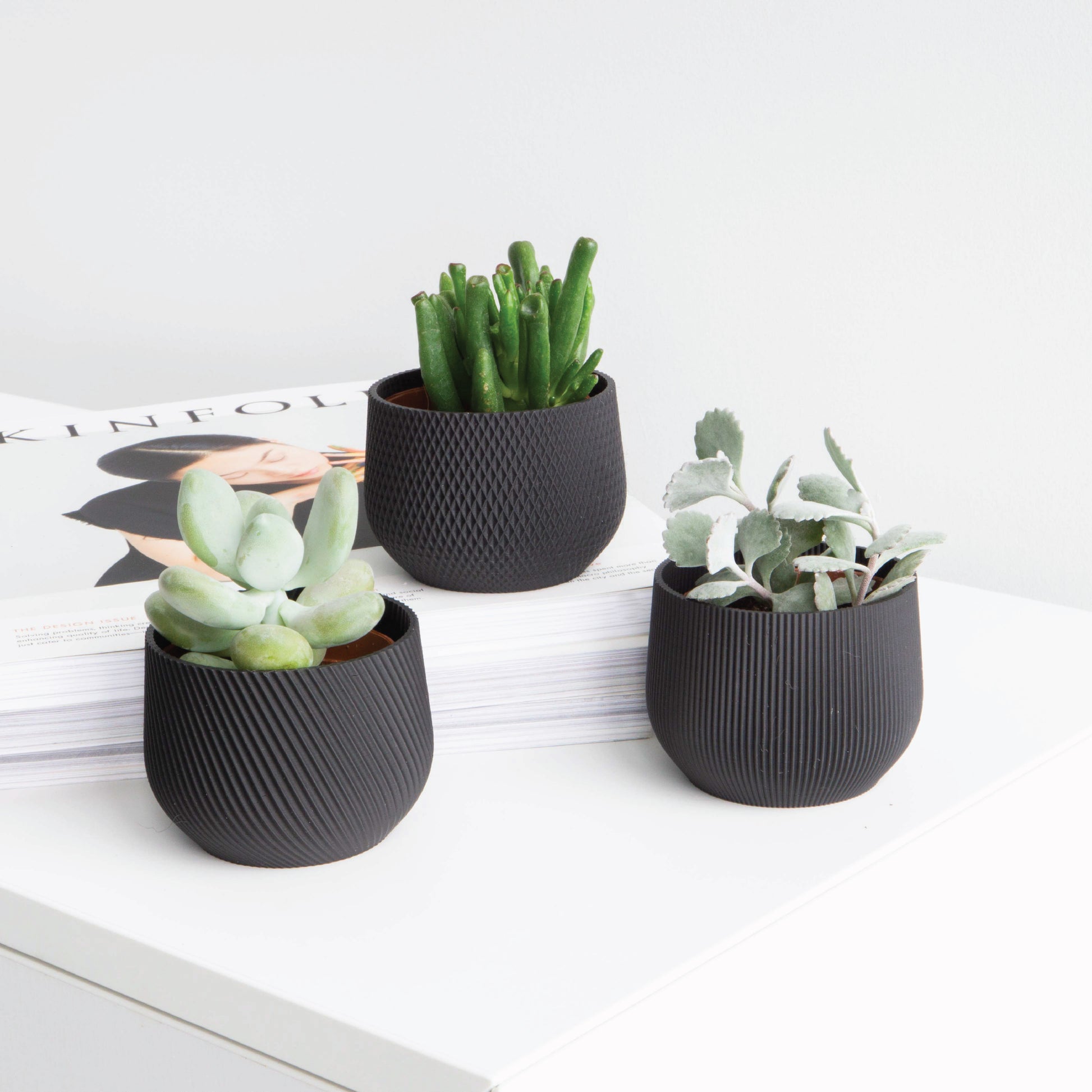 This mini indoor planter set is perfect for small succulents and cacti. They are 3D printed using sustainable, plant-based materials and are 100% zero waste! The planters perfectly fit 2" potted plants.